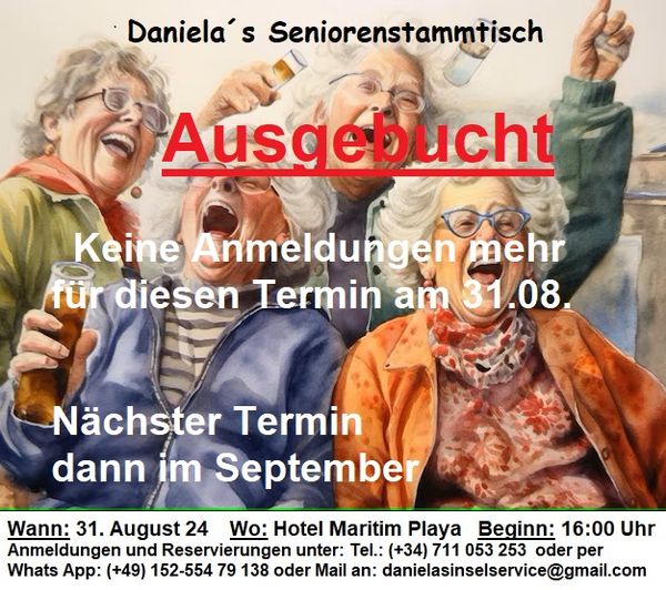 Ich war gestern beim Seniorenstammtisch im Maritim Playa, er fand innen statt in der hintersten Ecke im Restaurant. Das hat mir schon nicht gefallen, bei strahlendem Sonnenschein am Nachmittag will man doch draußen sitzen. Man saß an 4er Tischen, sowas empfinde ich nicht als Stammtisch, um Leute kennenzulernen. Ich hatte Bekannte entdeckt, wo ich mich zusetzen konnte. Daniela macht beruflich Seniorenbetreuung, sie hatte den Stammtisch mit ihrem Mann organisiert. Er machte die Begrüßung, aber von ihr als die Hauptorganisatorin hatte ich schon erwartet, dass sie mal an den Tisch kam, damit man mal ein paar Sätze reden konnte. Bei der Anmeldung hieß es, dass sie sich freut, mich kennenzulernen. Davon merkte ich dann nichts. Meine Tischnachbarn hatten als Raucher eher die Möglichkeit, draußen Kontakte zu knüpfen. Ansonsten verlief die Veranstaltung für mich wie eine Werbeveranstaltung, als irgendwann die Ausflüge vom Maritim Playa vorgestellt wurden, bin ich gegangen.