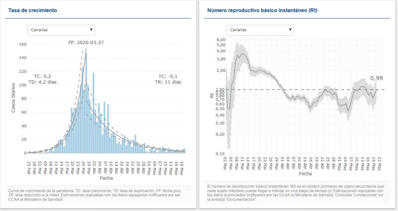 Hier dann mal kurz der aktuelle Stand des Verlaufs der Reproduktionzahl auf den Kanaren (rechts) veröffentlicht vom spanischen Gesundheitsinstitut Carlos III:
