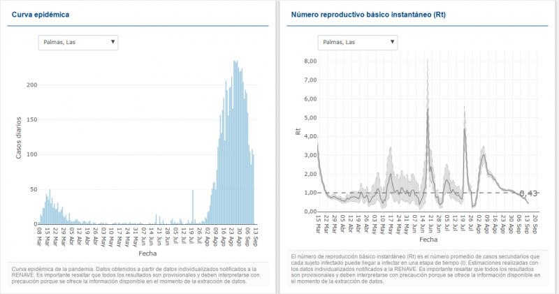 Das spanischen Gesundheitsinstitut hat die wöchentliche Aktualisierung der Statistik diesmal einige Tage früher als gewöhnlich veröffentlicht. Wie immer für die Provinz Las Palmas, also unsere Insel zusammen mit den östlichen kanarischen Inseln. Links die Anzahl der bekannten täglichen Neuinfektionen, rechts die daraus berechneten Reproduktionzahlen: