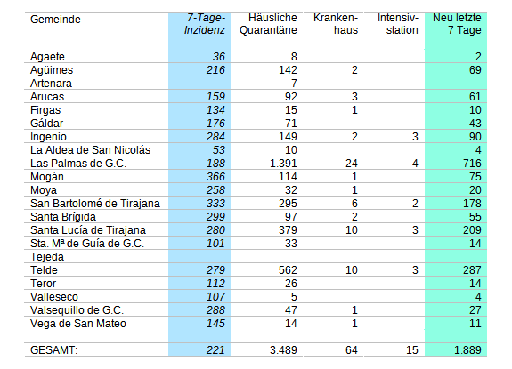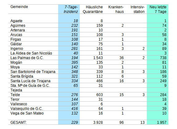 Habe mal die Aufschlüsselung nach Wohnsitzgemeinden aktualisiert. Wieder beruhend auf den Rohdaten des Servicio Canario de la Salud: