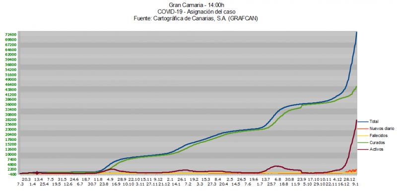 El cambio de nivel de alerta en ambas islas entrará en vigor a las 00.00 horas del próximo sábado 22 de enero. La Consejería adopta esta decisión extraordinaria tras el informe de Salud Pública que alerta de los incrementos en la ocupación de camas, tanto convencionales como de UCI, que han ascendido a riesgo muy alto en Gran Canaria. En La Palma están en riesgo alto en ocupación de camas convencionales y en riesgo muy bajo en las de UCI