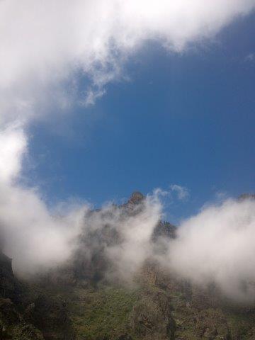 Mit 8 Uhr Bus bis Cruz Grande, dann den Weg nach oben, unbedingt zum Ventana del Nueblo (wunderschöner Ausblick und Fotos), zum Pozo de las Nieves, zurück bis zum Einstieg zum Abstieg (N27 57 39.3 W15 34 38.8 - ab hier wird’s heftig ruppig, stellenweise nur bis max. 2km/h), gelegentlicher Blick auf Risco Blanco, nach Tunte – San Bartolome, Haltestelle Globalbus.