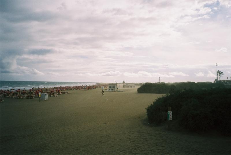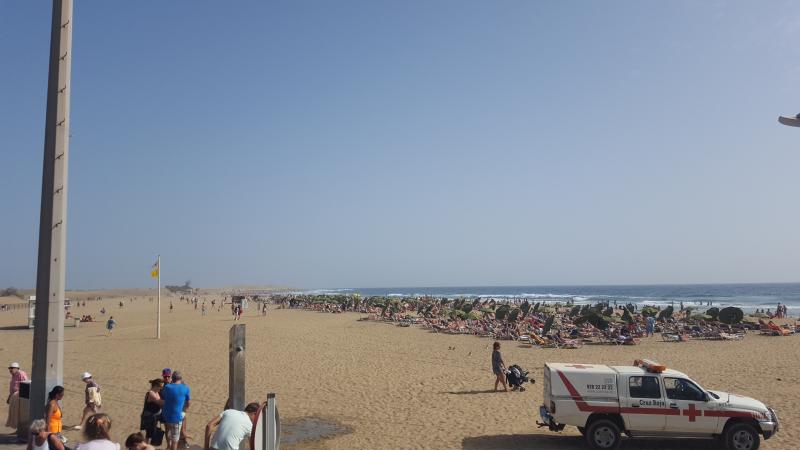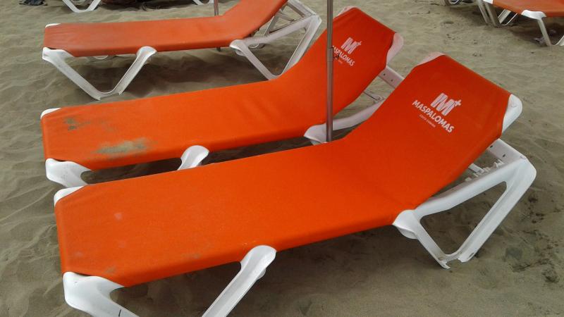 Bis auf einen kleinen Abschnitt strahlt der Strand von Playa del Ingles in orangfarbenen Liegen und Schirmen.