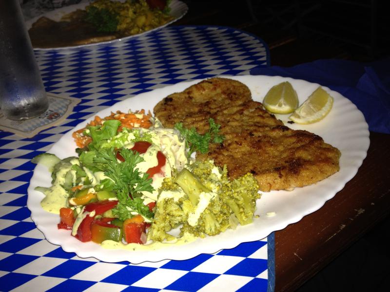 Bild #2070: Stimmt ist auch schwer. Blau Weiss mit Schnitzel drauf ist leichter zu erraten :-) Vor der Auflösung des Rinderfiletspiess mit Kroketten und selbstgemachter Spezialsauce noch ein Hinweis: Die Tischdecke sollte eher Rot mit weissen Kreuzen sein (nein, nicht die Rot-Kreuz-Station) und das Lokal ist in der Cita. Soll auch nur ein Hinweis sein, dass man trotz aller Unkenrufe in der Cita sehr gutes Essen bekommt. (ok, sehr schlechtes allerdings auch...)