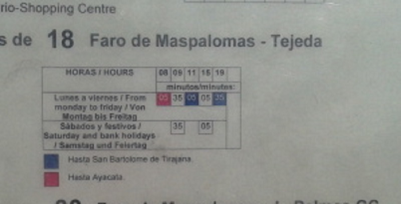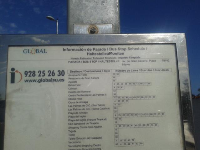 Das Haltestellenschild an der Plaza Hierro (gegenüber Planet Bayern) ist die einzige Haltestelle an der die Linie 18 (Fahrtrichtung in die Berge) in Playa del Inglés hält (Ich lade gleich ein Foto der Uhrzeiten hoch).