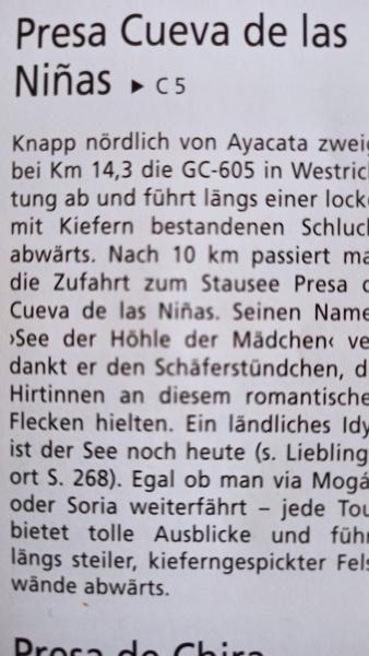 Ca. 250 m hinter der scharfen Kurve geht es links auf die "GC 605", dort wie beschrieben -nach ca. 10 km- gibt es an der "GC 605" einen Parkplatz & "Zona Recreativa Presa de Las Niñas", von dort aus sollte man dann starten.