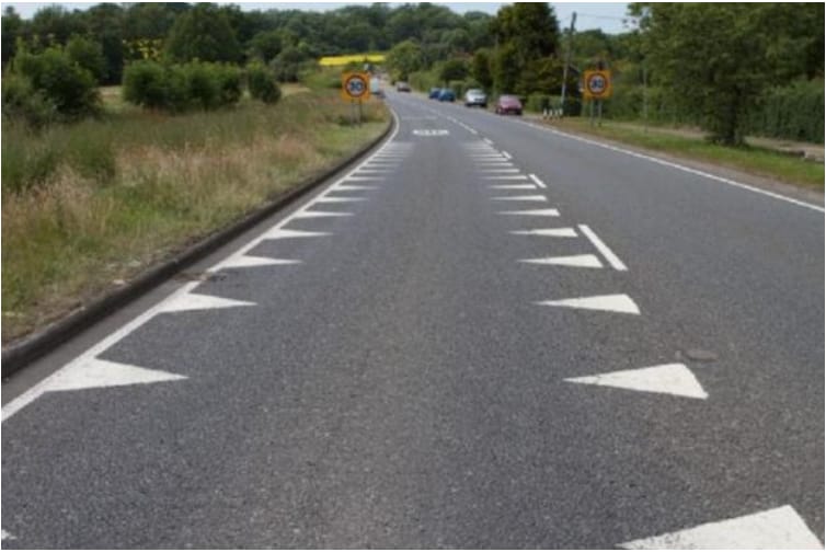 Diese Markierung befindet sich allerdings noch in der Erprobungsphase. Sie soll den Fahrer durch die "optische Täuschung" dazu verleiten die Geschwindikgeit zu verringern.